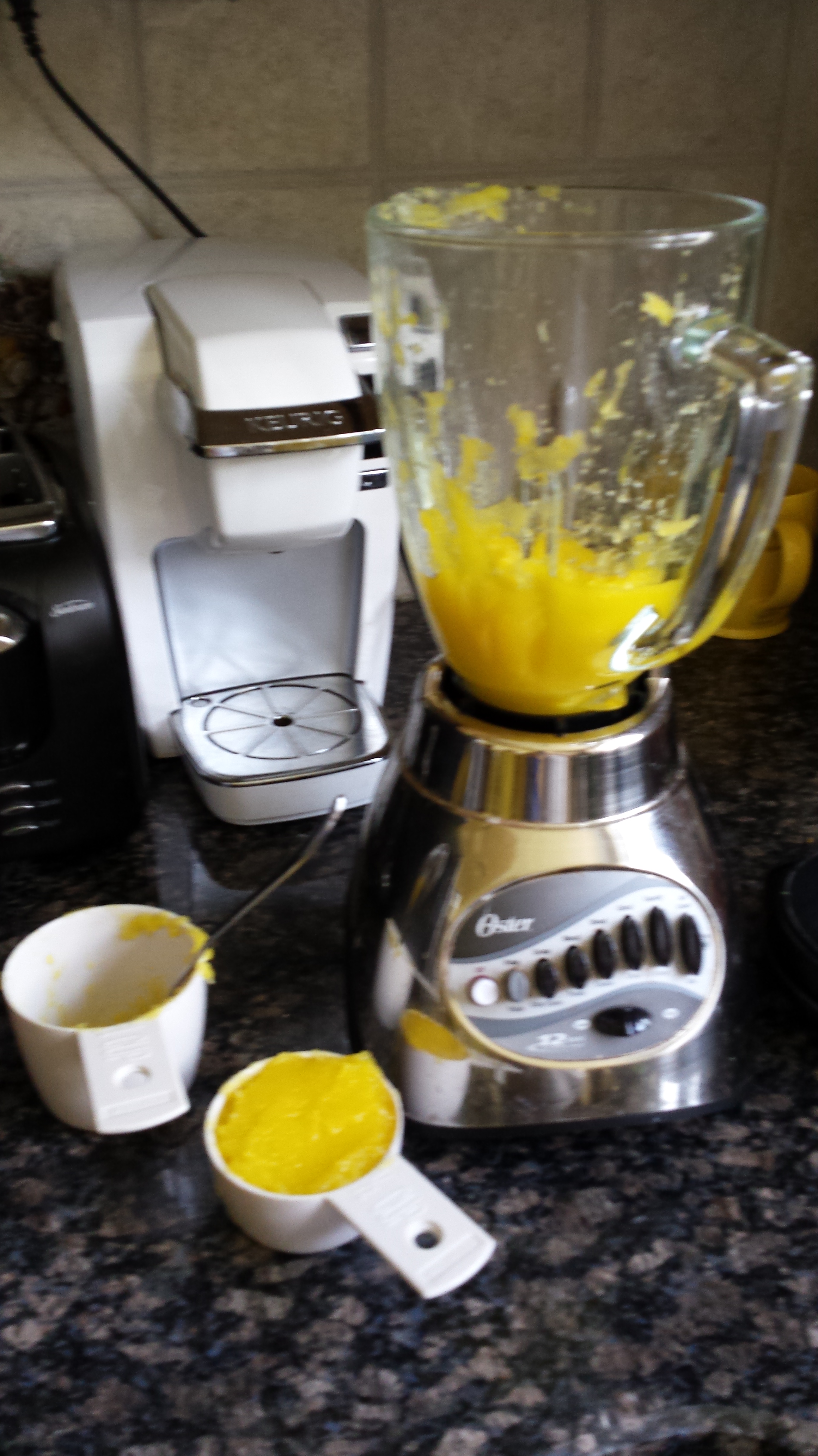 Then it was time to puree the flesh. I really need to get a food processor, because a blender just does not do as good a job. But eventually it was all ready. I got about 1.5 cups out of this pumpkin. I probably could have gotten more, but I really didn’t want to go anywhere near that messed-up spot. Also, I just got tired of trying to get the skin off. Also, I didn’t really want too much from this pumpkin because it was kind of weird looking. I have two plants that are producing cute little sugar pumpkins (see pic below) and two that are producing these elongated, squash-looking specimens, even though I thought they were sugar pumpkin seeds. It probably won’t matter in the end, taste-wise, but…