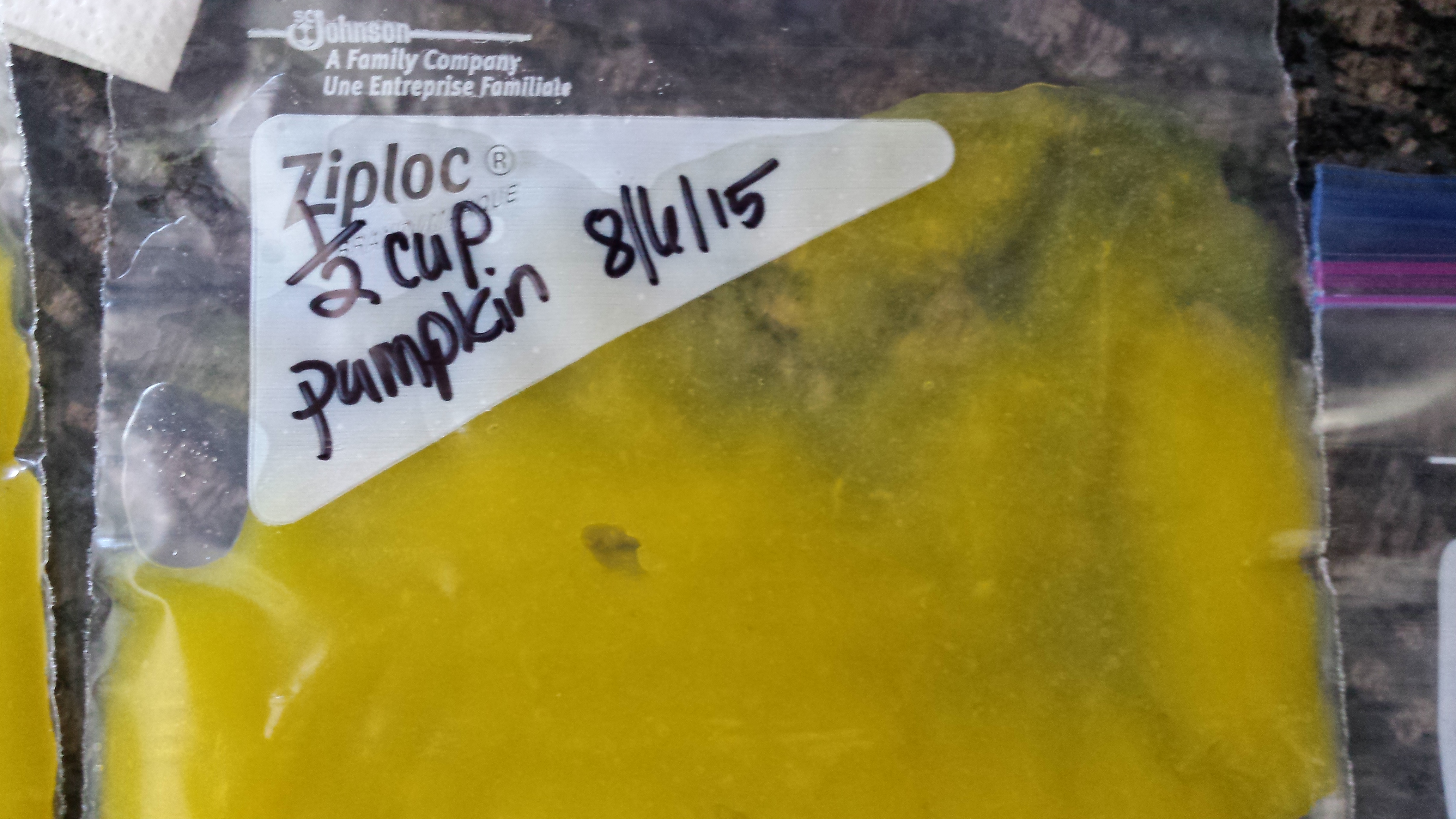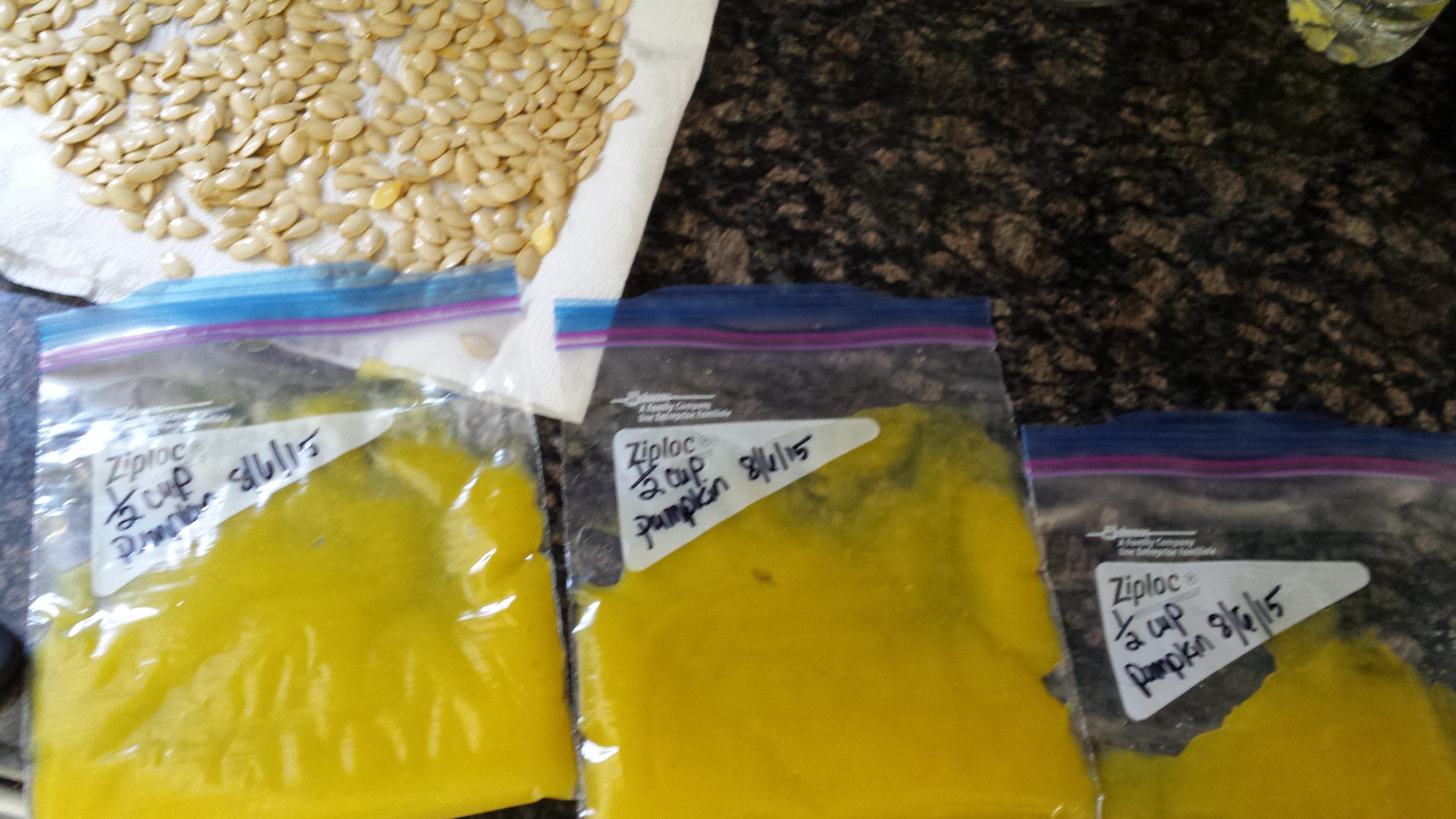 I separated the puree into half-cup portions, and into the freezer it went. I think I will do this with all the pumpkins that have already been picked. The ones that are still on the vine, I will try to save for Halloween by curing them.