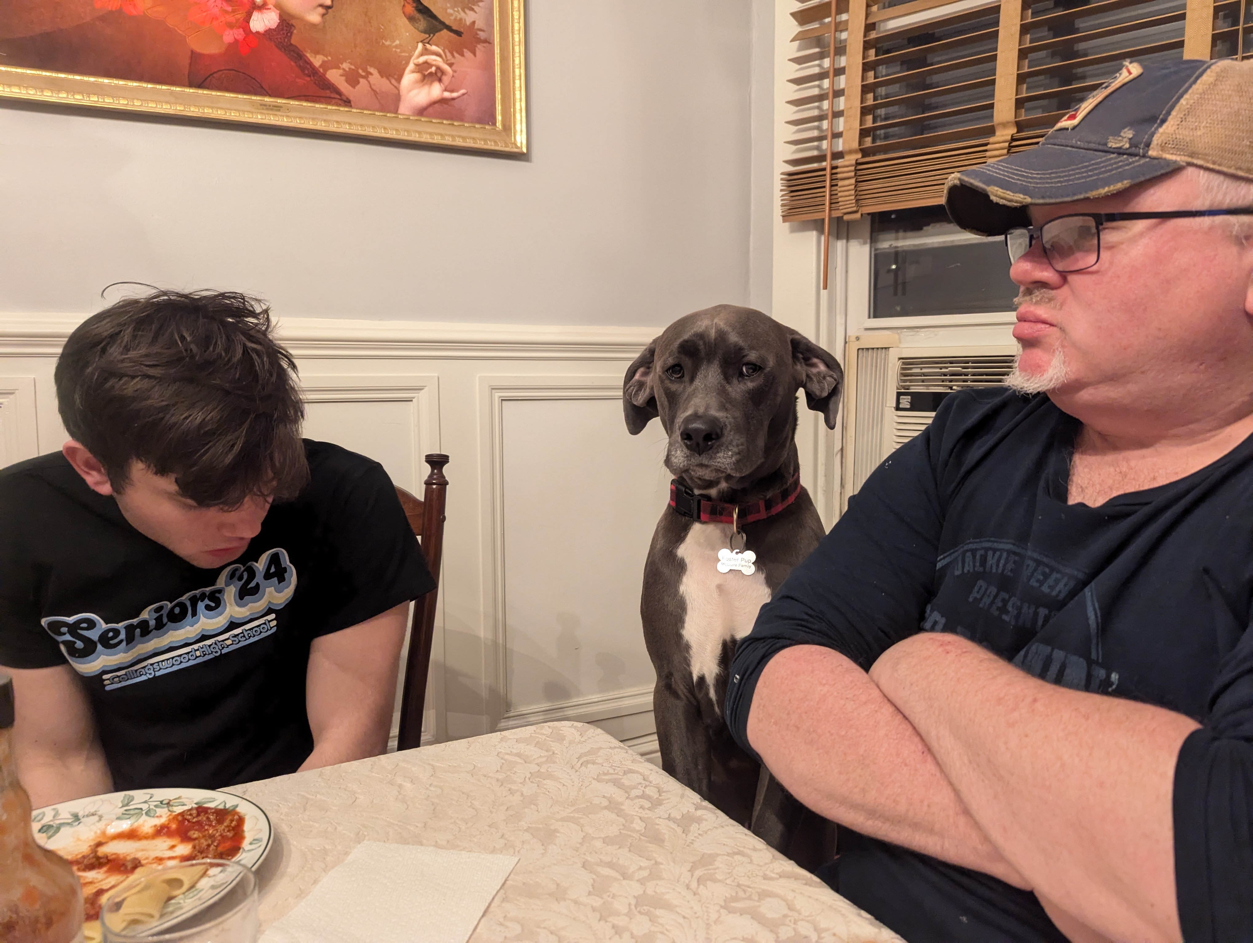 This morning was sunny and it went up to 40 degrees. I had a nice walk with Rocco in the afternoon. In the morning, I made gravy so we can have spaghetti for dinner tomorrow. I had meatball mix and about 16 oz of pureed garden tomatoes in the freezer, as well as plenty of canned tomato sauce and paste. Then it was off to Acme to get those targeted groceries. I spent $102 on things like milk, orange juice, a whole chicken that I’m going to roast, a loaf of Italian bread, pickles, turkey lunchmeat, and a big bag of cat food. I scored some brownies in the bakery markdown section for $2. For tonight’s football playoff game dinner, I bought chips, taquitos and chicken nuggets, thinking that would at least be better than ordering food like we probably would otherwise. I turned half of the Italian bread into cheesy garlic bread using shredded mozzarella from the freezer. Everyone seemed to enjoy it. It wasn’t exactly the festive spread I envisioned, but oh well.