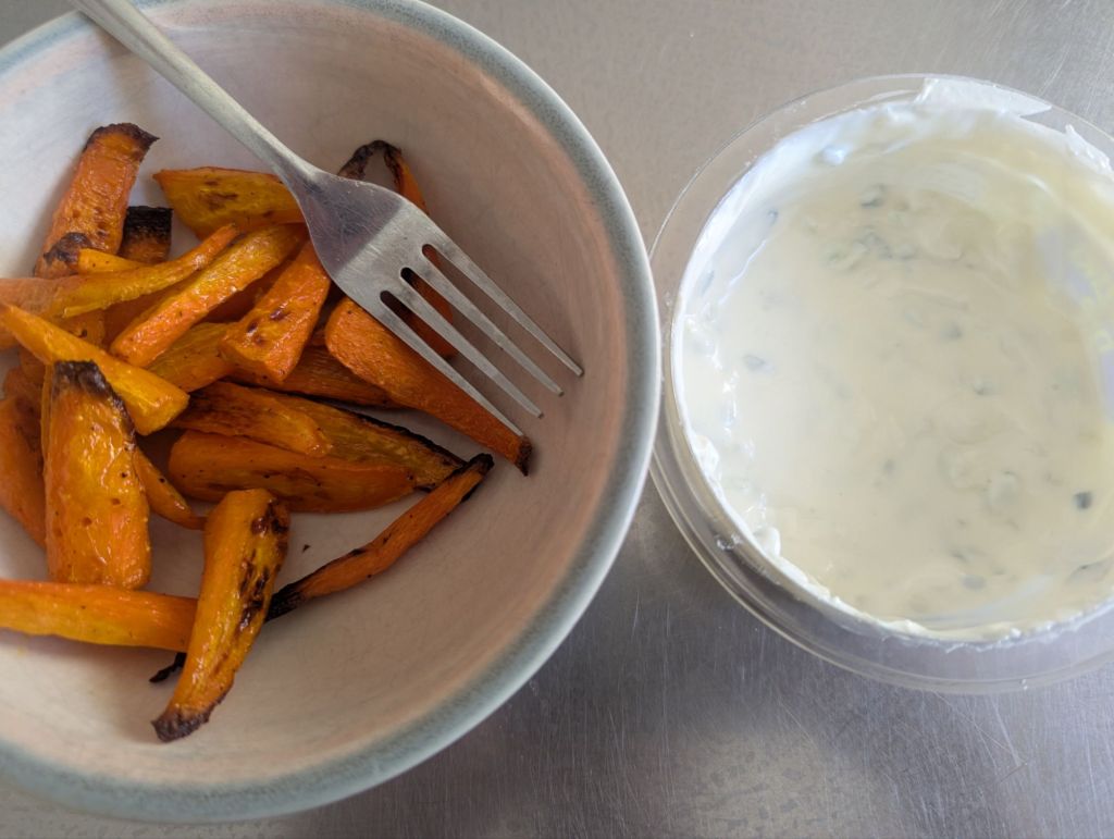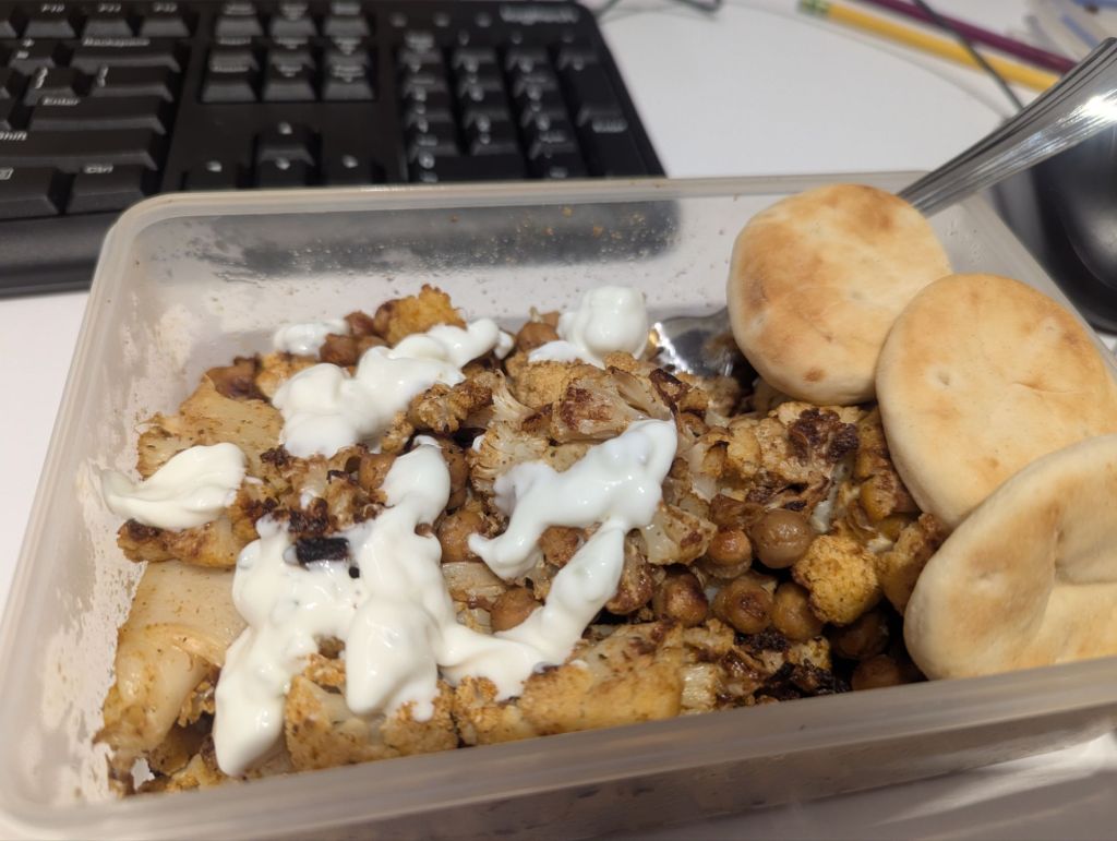 My lunches were better: leftover roast chicken on toast with mayo and avocado, and the same chicken with roasted cauliflower, chickpeas and tzatziki sauce; also, tuna and crackers. Supplemented with fruit and yogurt. The chickpeas had just expired; the can had languished in the pantry for years. Yesterday I roasted carrots to eat with the tzatziki as part of lunch. Yummy. I do miss getting lunch at Cava in the city, but I’m halfway to recreating it with these veggies (seasoned with cumin, paprika, salt and pepper).