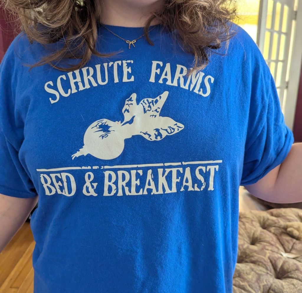 Tom and F. visited Pitman yesterday after T. did an estimate nearby, and F. got a pretty funny shirt at a thrift shop for $8, courtesy of her dad: