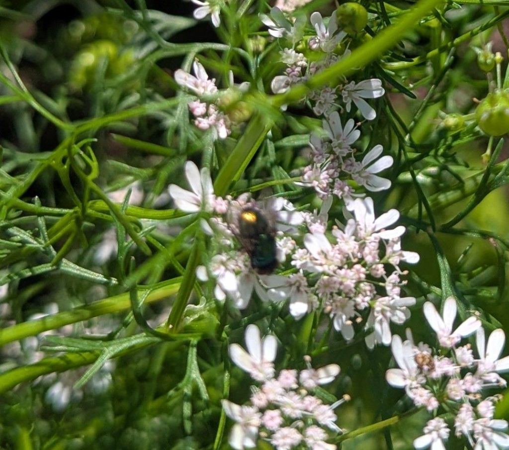 On Memorial Day morning, I spent some time gardening and discovered a tiny bee (or bee-resembling insect?) in the cilantro flowers. I couldn’t get a picture of it, but did get one of a fly that was also pollinating: