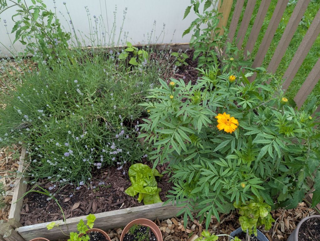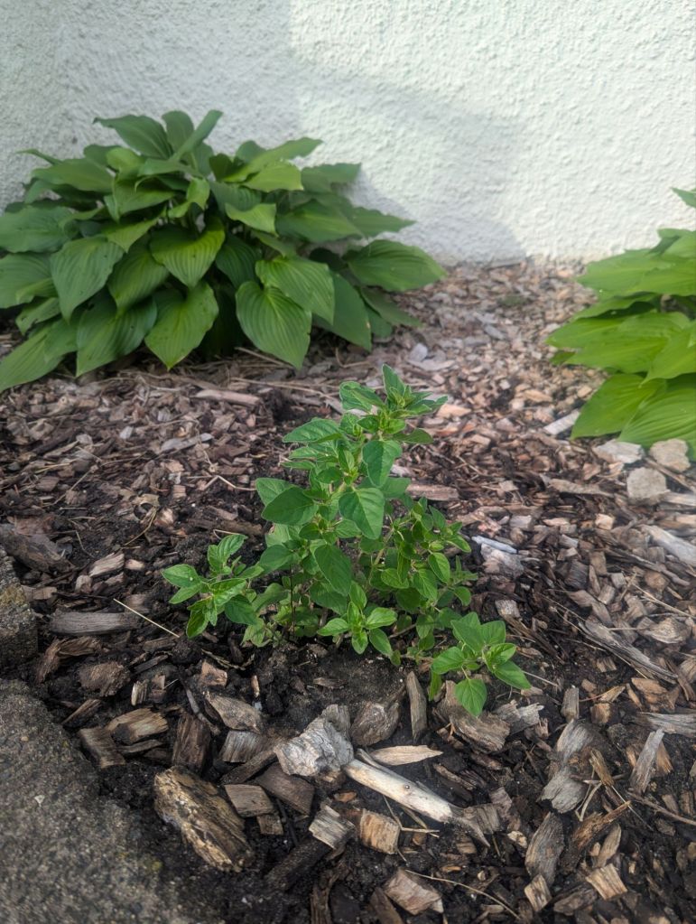 Everything else is doing pretty well, even the onions. I moved some of my extra oregano from the back yard to the front, a free and easy way to get some flowering perennial plants in that front space.