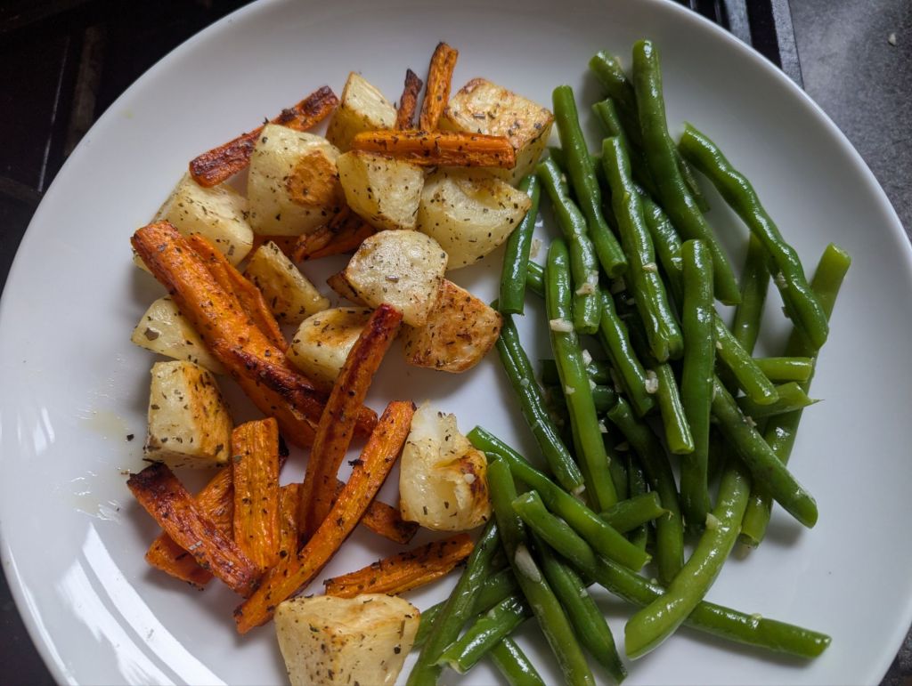Yesterday, I roasted carrots and more red potatoes, and sauteed green beans, and made mashed potatoes from some russets. I thought we were going to make chicken to go with it, but everyone was out and about and ate dinner elsewhere, so I had an all-veggie dinner by myself.
