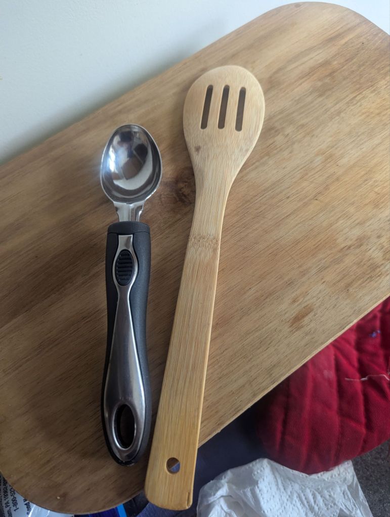 Almost forgot — after the farmers’ market, we stopped at a nearby estate sale. Hadn’t been to one in a very long time. There wasn’t much of interest to me and F, but I did get an ice cream scoop, which we’ve been needing forever. F. got some markers and scrapbooking materials. It was fun to poke around.