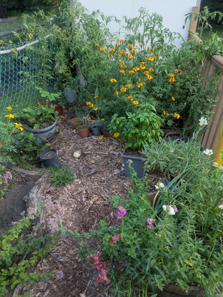 I had been thinking about buying or building some tall raised planters, but after the electric bill came, I put that idea on hold. It was more than $800, possibly the biggest one I’ve ever gotten. Everyone was bitching about it on FB, and I gather that rates went up. So instead I moved some stuff around and in essence now have two repurposed large pots high enough off that ground that Rocco won’t bother them. That will help once it’s time to plant out the fall seedlings. Glad I resisted the urge to spend.