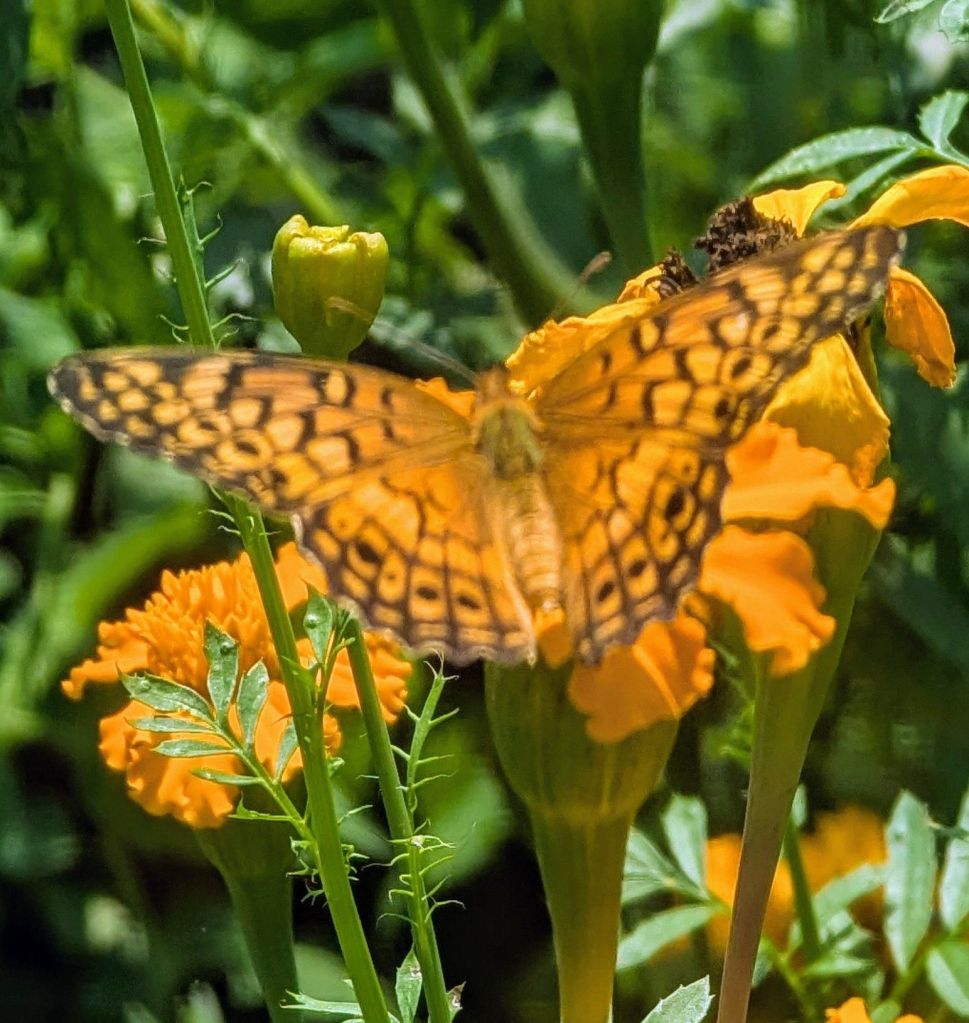 Also on Monday, I spied what I think is a fritillary butterfly flitting among the marigolds. Maybe a variegated fritillary? Exciting — I don’t see too many butterflies out there.