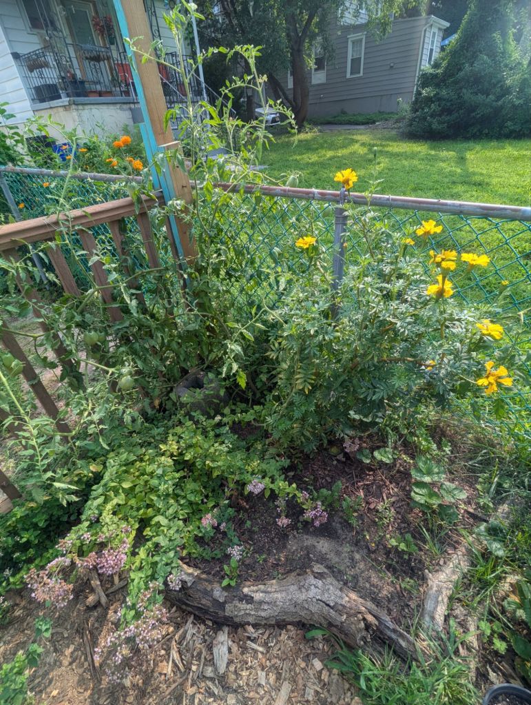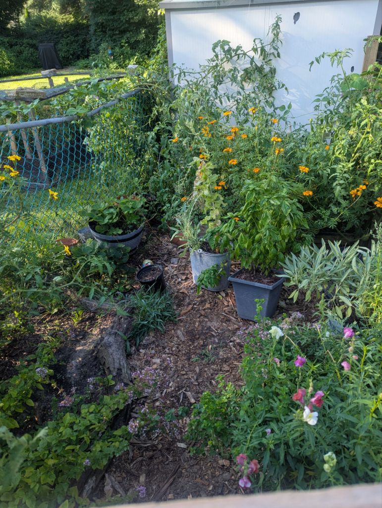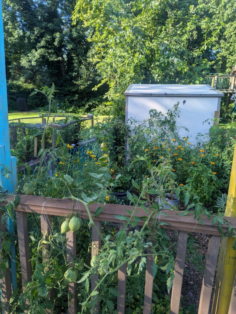 Friday was supposed to be my big day to “do something.” But Tom ended up having to work and F said she was beached out. So I decided to dedicate the rest of my staycation to materially improving the back yard and garden. We kicked off that plan by fueling up with Wawa (iced latte for me).ย (I should mention that every morning and evening we were also feeding our vacationing friends’ cats.) I located and secured a used tall planter on Facebook marketplace for pickup that night. Then it was off to Ace Hardware for soil to fill it and twine to tie up more tomato vines. Then Acme for s’mores supplies for that night. F and I then headed over to Plato’s Closet where we both made out well — I got two pairs of badly needed shorts for $20 (in perfect condition) as well as a fun T shirt and flip flops. From there we meandered down to Mount Royal, where the planter was waiting ($40).