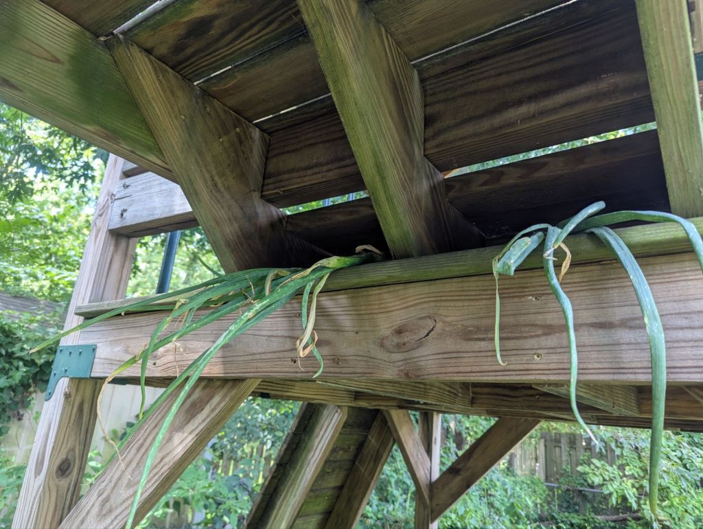 They went up on the playset to cure. My grand onion total is… 5. It will be better next year!