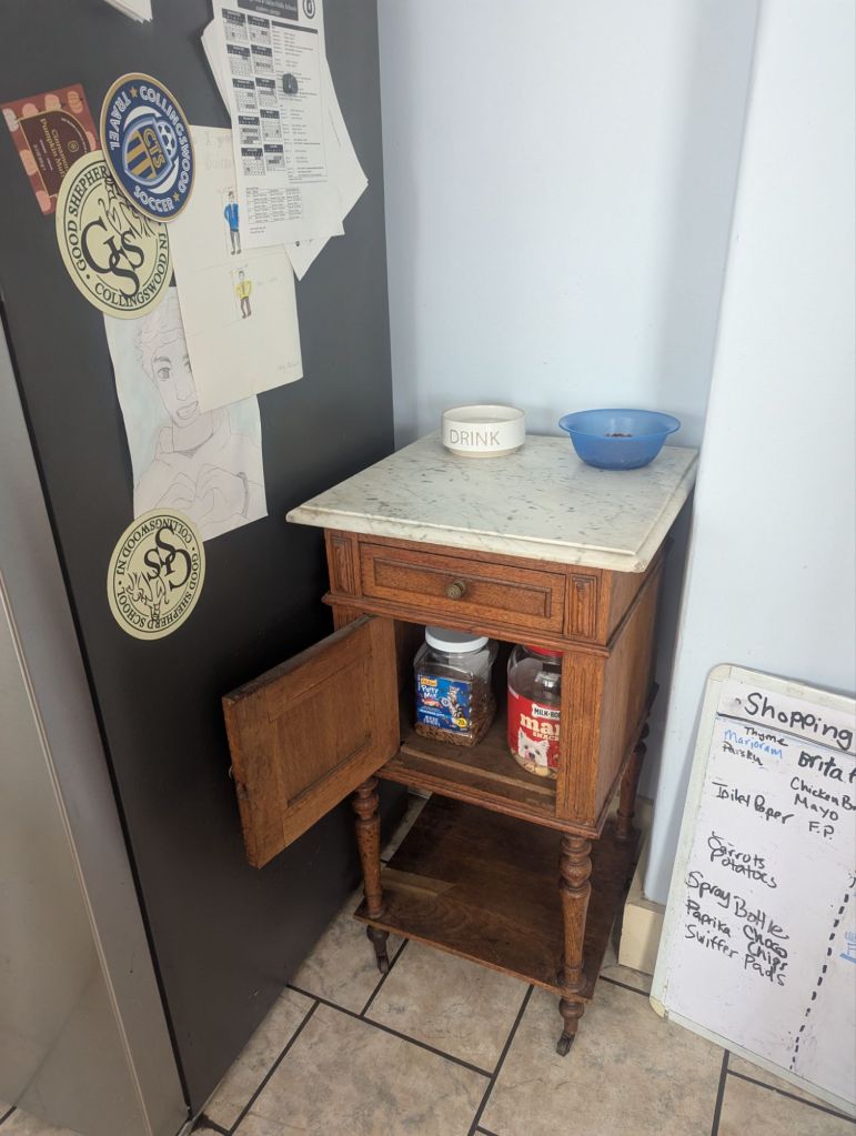 But wait, there’s more! Saturday F and I went to a nearby yard sale and I found the perfect-sized piece for the space next to our fridge, for $10! It’s narrow enough to fit and tall enough for the cat’s food to be safe from the dogs. And it’s antique. I love it.