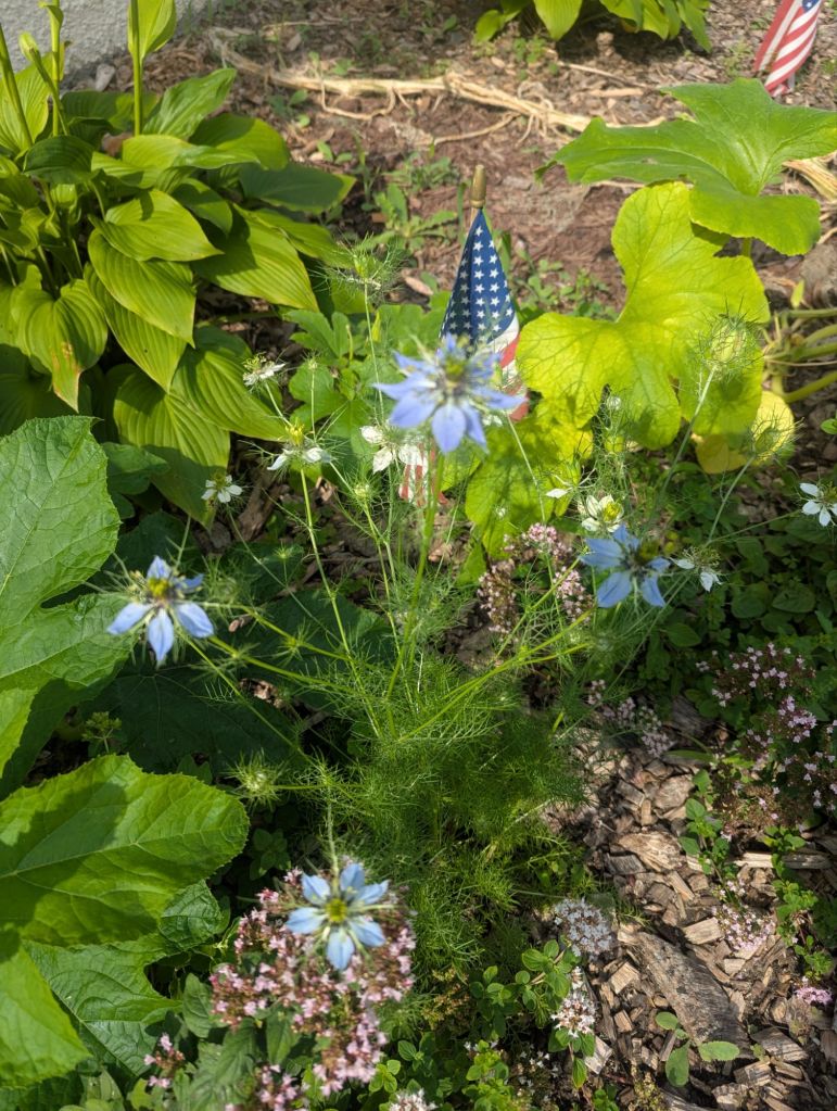 And those white flowers out front are tuning blue! I believe they are “Love in a Mist.” Aka Nigella damascena. Not native.