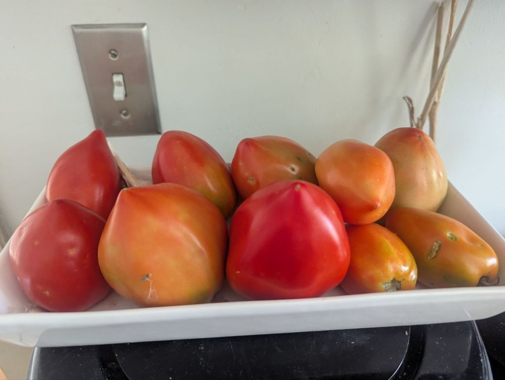 I picked one or two reddening tomatoes every day this week and processed some ripe ones. Then this haul today: