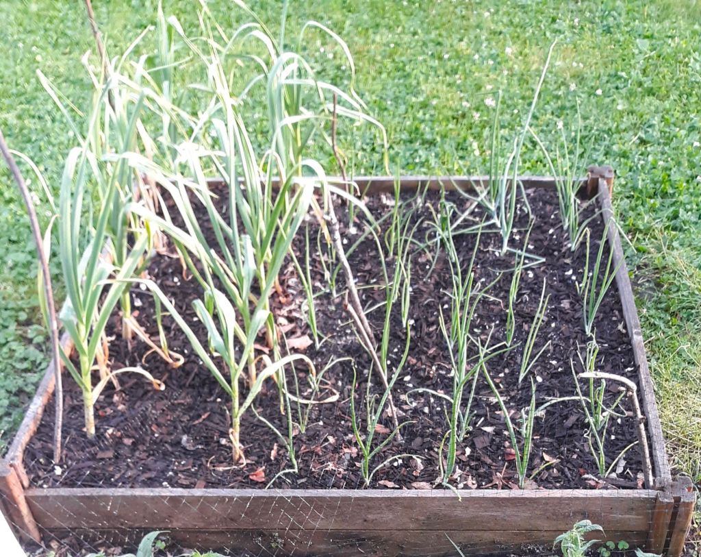 Garlic is ready to harvest around July, when about half of the leaves of the plant die back. Stop watering a week or two before you pull it. When pulling them, do so very carefully — dig around the roots to loosen them. The plants can then be laid out in a dry, breezy, shaded area to cure for a few weeks. I have used a front porch and currently use the kids’ old playset. You can also just use some of it fresh, without curing.