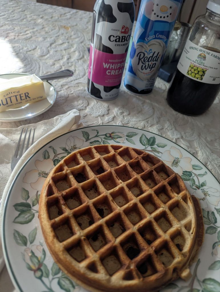 This morning, at F’s request, I made homemade chocolate chip waffles. I used white whole wheat flour and there were no complaints. It made two big waffles so there is one in the freezer now.