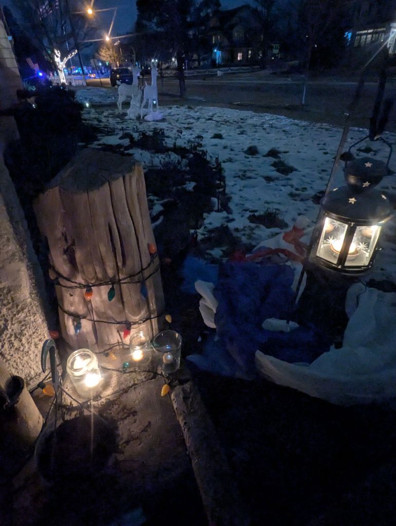 Saturday night, we all sat around watching coverage of the storm and of the shooting in Minneapolis, and getting angry. I ended up lighting some candles and putting them outside, as a vigil. Not much, but I had to do something.