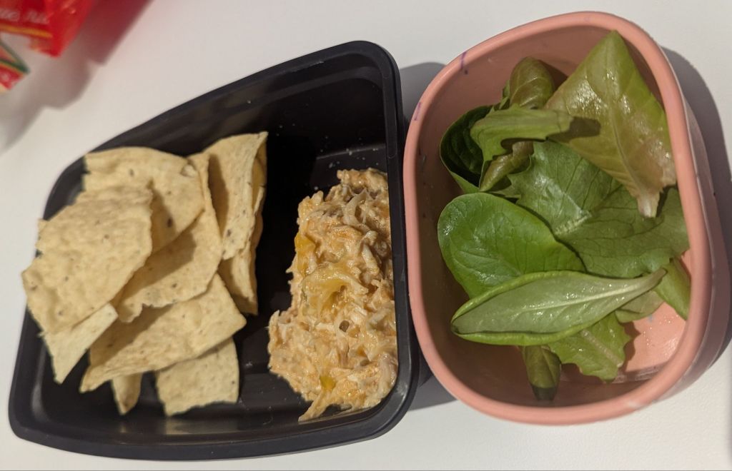 Tuesday lunch: leftover salsa chicken with lettuce thinnings, cheese, and tortilla chips