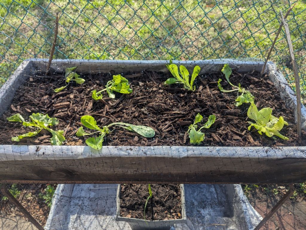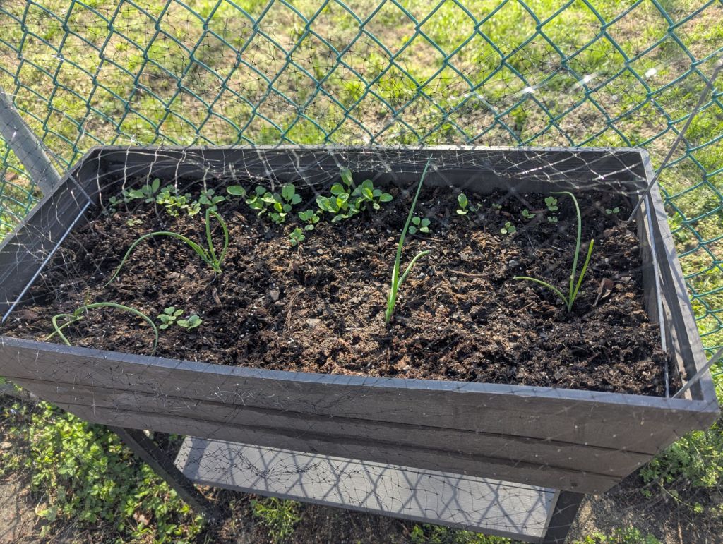 Friday night and Saturday, I experienced the thrill of planting out lettuce and onion seedlings (8 and 20, respectively). Followed quickly by the despair of watching the lettuce wilt in the almost 80 degree temps on Saturday. Luckily, the temperature dipped in the afternoon and they pulled through. I was able to protect the ones in the tall planters, with netting, but a squirrel has already disturbed some of the ones on the big raised beds. Little jerks, after all the food I’ve given them at the bird feeder! I need to get netting on there somehow.